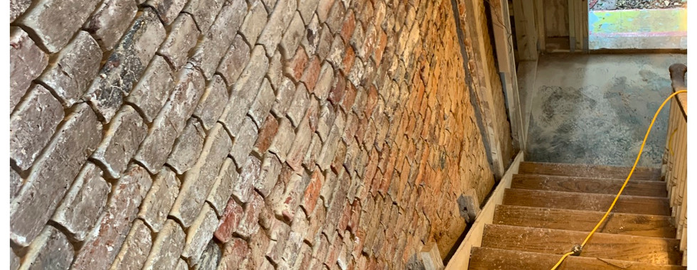 During discovery, the builders found damp materials and rot in the walls, which led to them having to strip back the plaster and lath. In doing so, they happened upon the original brick exterior wall that was most likely the original kitchen house.